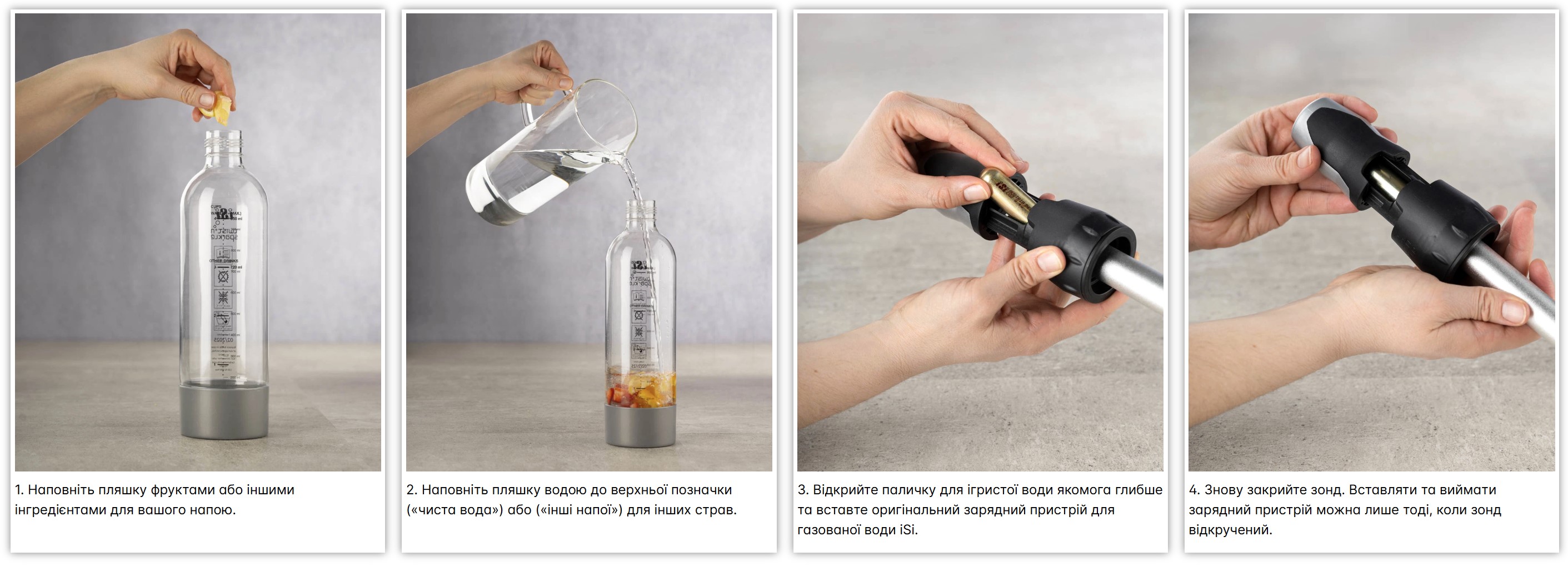 Завдяки унікальній технології газування ви можете експериментувати без обмежень — створюйте освіжаючі безцукрові або низькокалорійні напої, додаючи до них свіжі фрукти, ягоди чи ароматні трави.