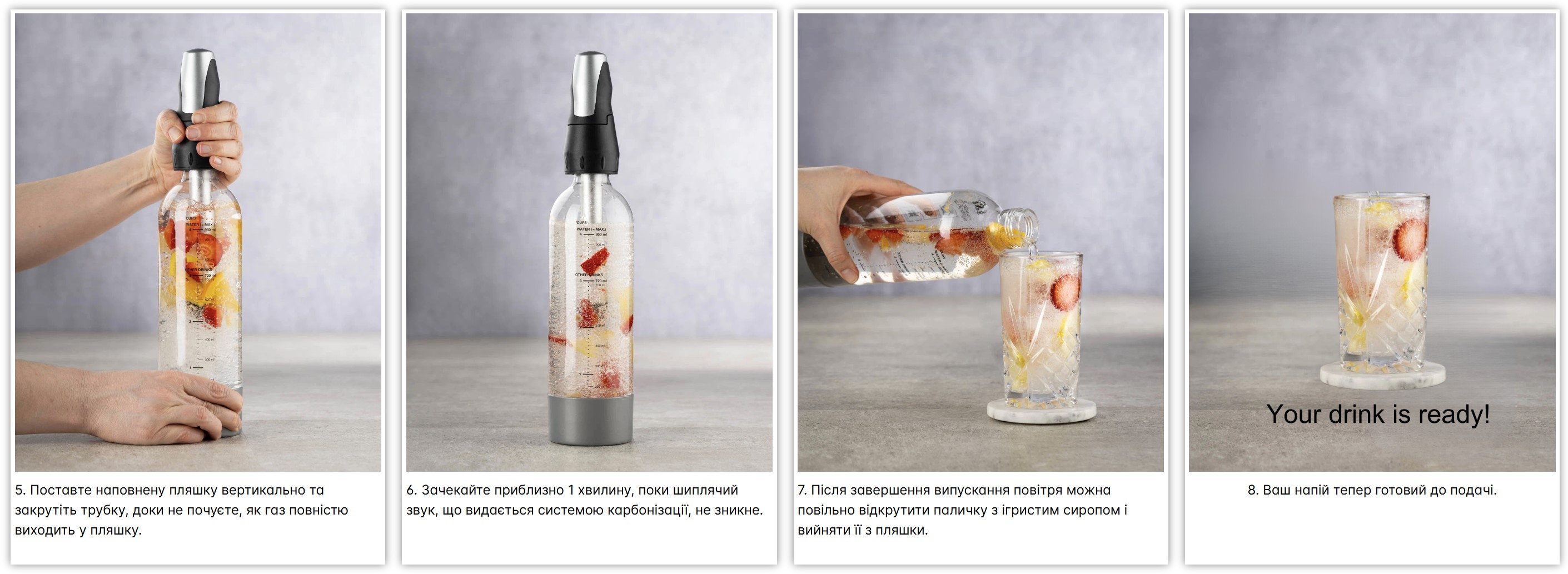 Завдяки унікальній технології газування ви можете експериментувати без обмежень — створюйте освіжаючі безцукрові або низькокалорійні напої, додаючи до них свіжі фрукти, ягоди чи ароматні трави.